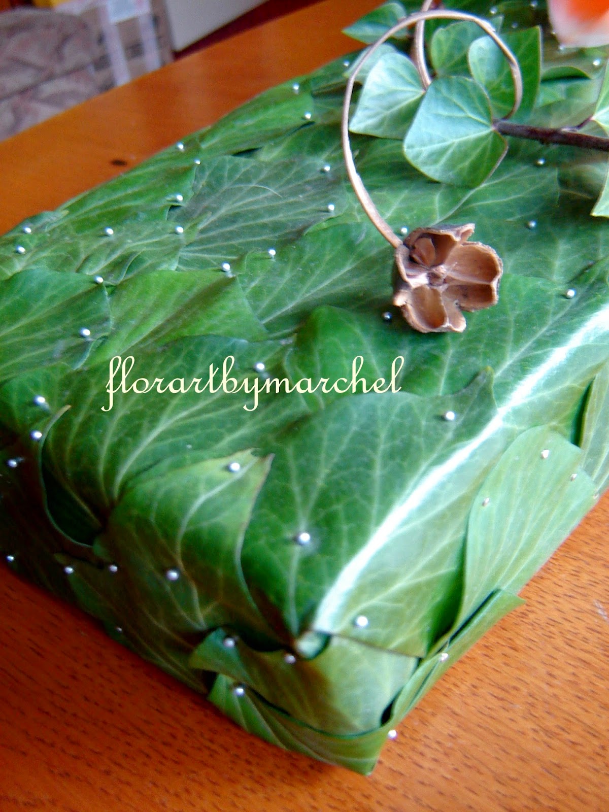 | podstawa serca wykonana ze styropianu, obłożona hederą, gąbka do żywych roślin przymocowana patyczkami szaszłykowymi. |